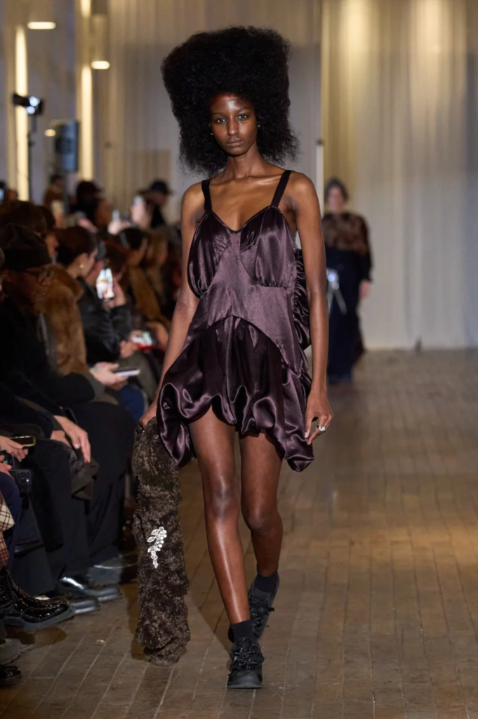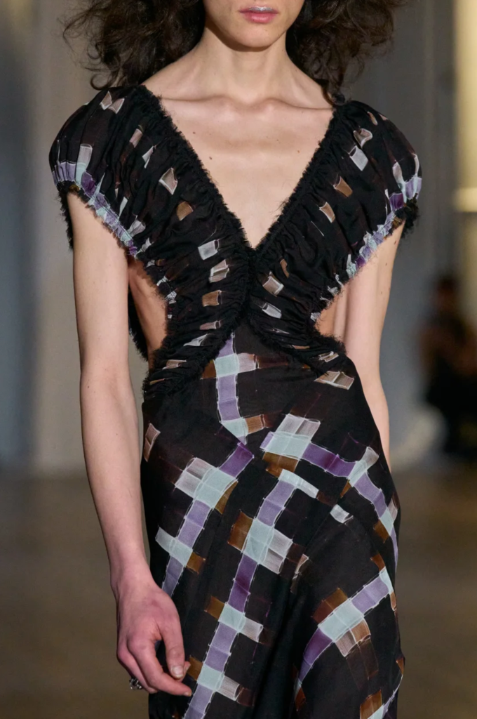 “I really feel there’s more and more male dominant forces at the biggest brands – there’s only men dressing women. So I wanted to say, Hey, this is sexy,” said Collina Strada designer Hillary Taymour, who showed a number of sultry but funky slip dresses – always the bestseller in her Chinatown store, according to the designer, and the kind of thing you wear so often to go out to dinner or grab a latte in the morning that it stays in a heap on your bedside chair rather than ever making it to a hanger in the closet.
